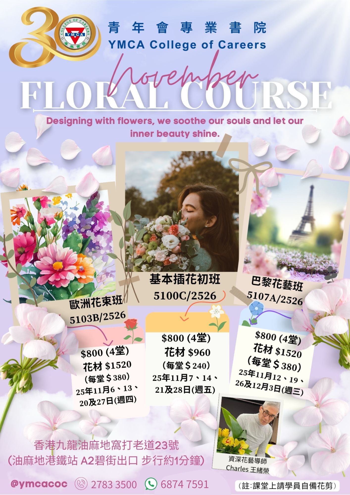課程費用: $800 + 花材費用 (導師收取): $1,520 (每堂$380)