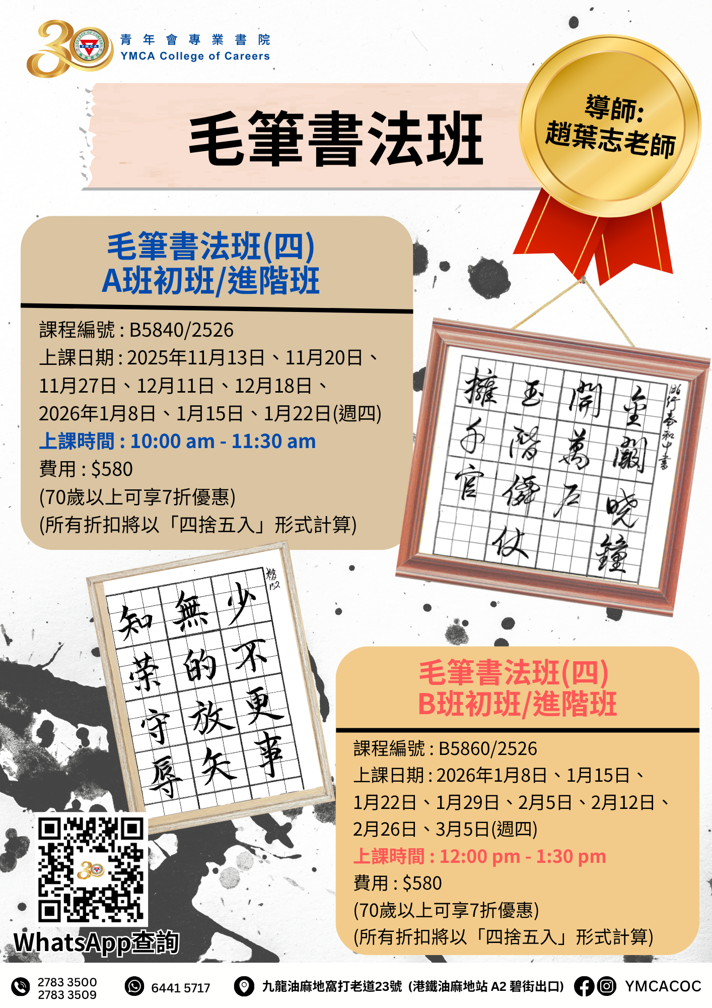 毛筆書法班(四)A班 初班/進階班 B5840/2526;B班 初班/進階班 B5860/2526