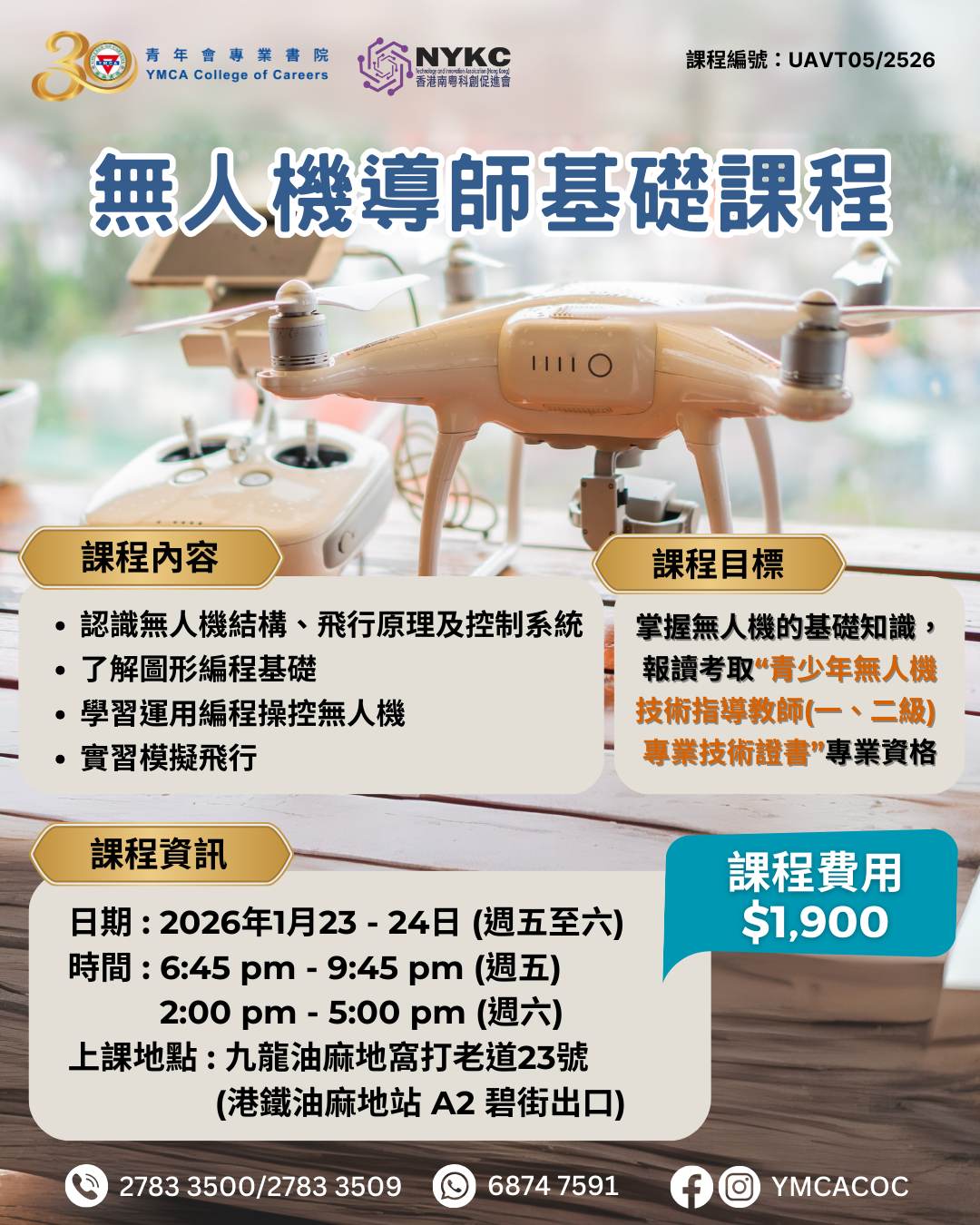 - 課程適合初學者, 由基本知識開始, 認識學習無人機技術, 並可進階修讀考取青少年無人機導師專業資格。