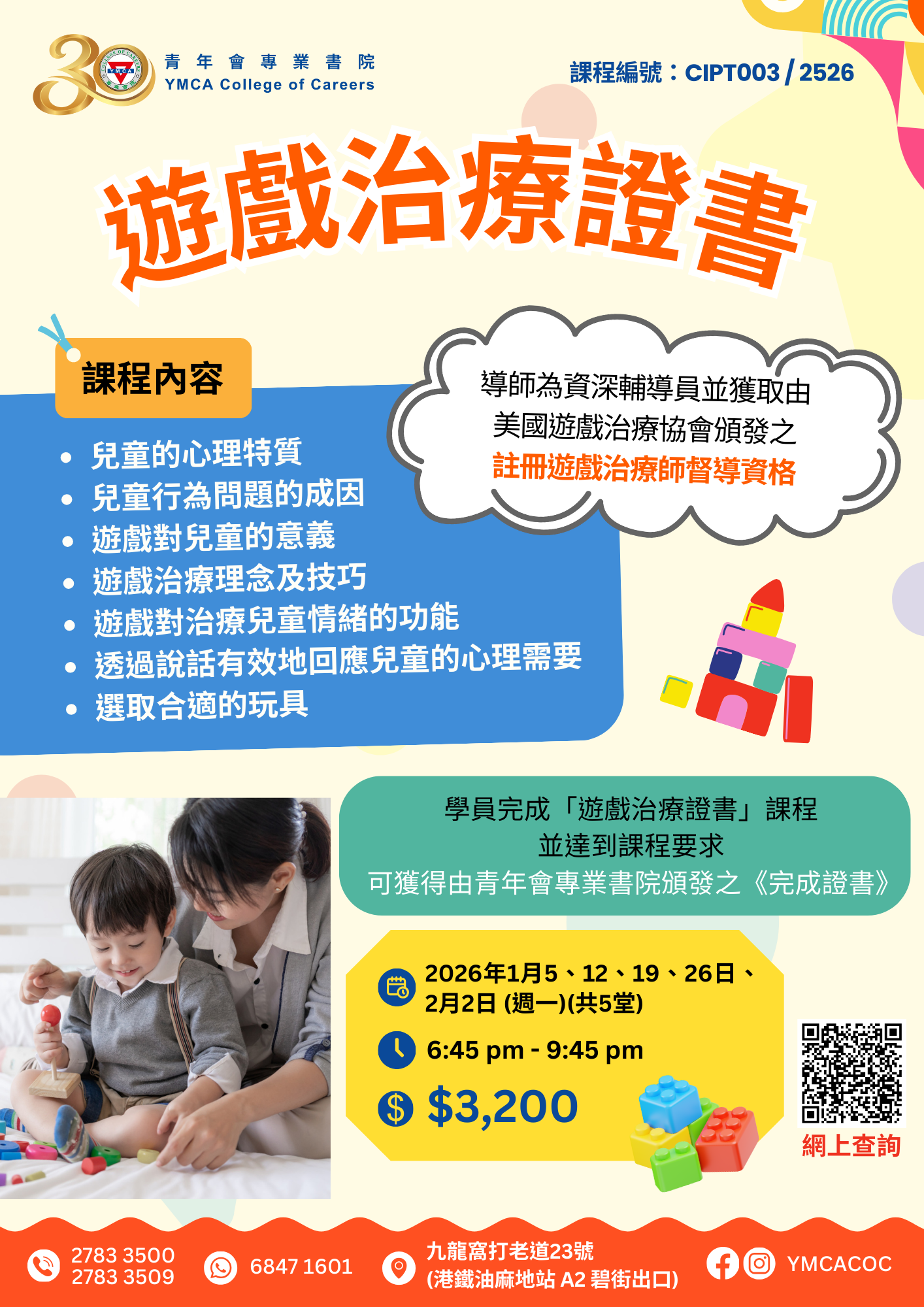 學員完成「遊戲治療證書」課程,並達到課程要求,可獲得青年會專業書院頒發《完成證書》。